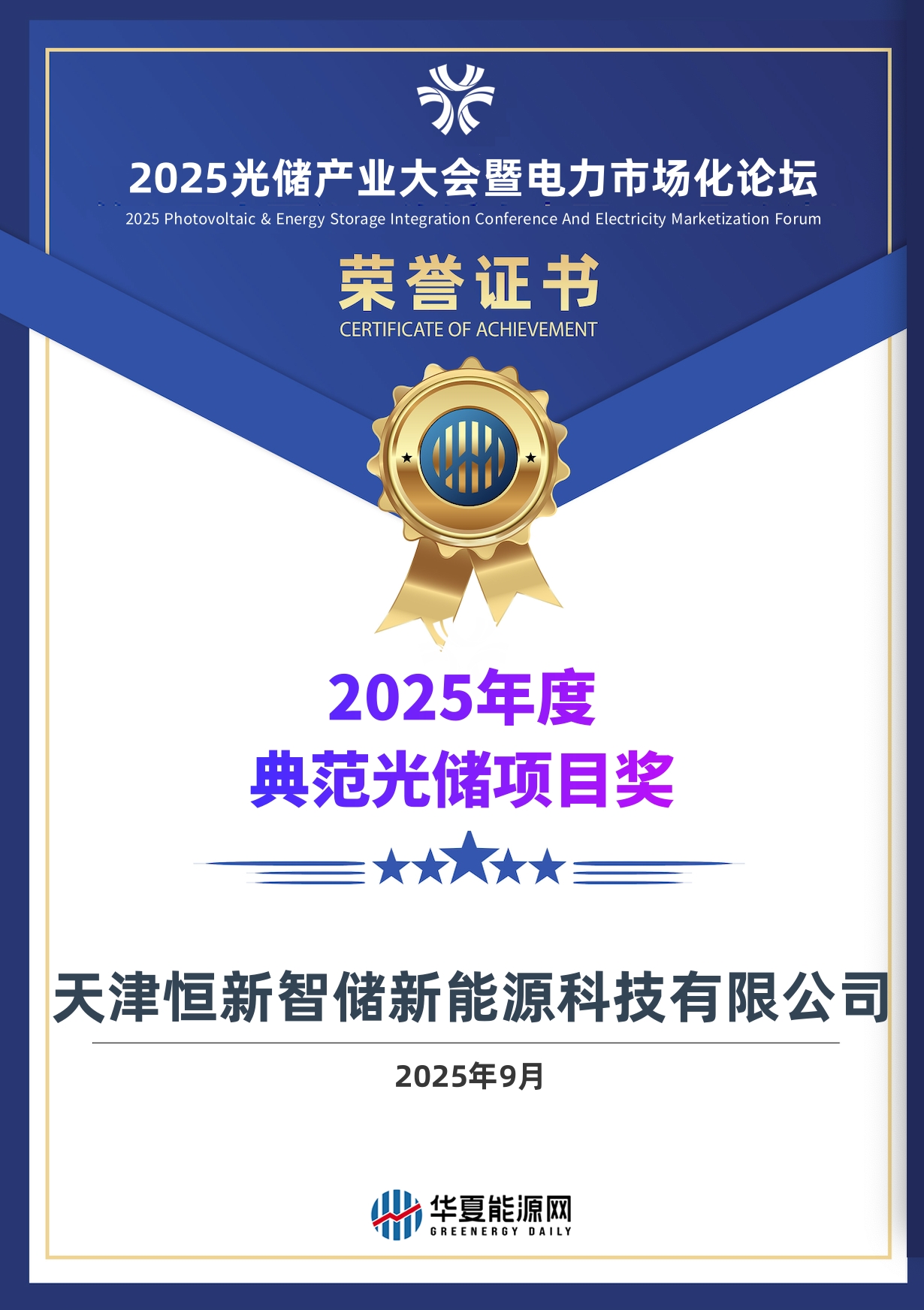 2025年上半年,全国新型储能装机规模达到9491万千瓦/2.22亿千瓦时,较2024年底增长约29%,储能领域正迎来高速增长期。在此背景下,9月19日,由华夏能源网、华夏能源研究院主办的“2025光储产业大会暨电力市场化论坛”在苏州隆重举办,大会同期揭晓了2025光储产业大会年度奖项的评选结果。北京恒源新能科技有限公司(以下简称“恒源新能”)储能板块:天津恒新智储新能源科技有限公司凭借技术创新性与商业可行性,从众多参选项目中脱颖而出、凭借在光储融合领域的卓越实践,荣膺“2025年度典范光储项目奖”。